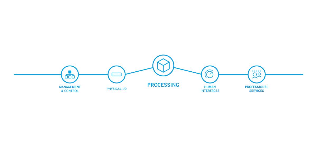 Let us begin with the five elements required in any broadcast and media production workflow. First, you need devices to which video and audio signal sources and destinations can be connected. These stageboxes or gateways will be called ‘physical I/O’.
