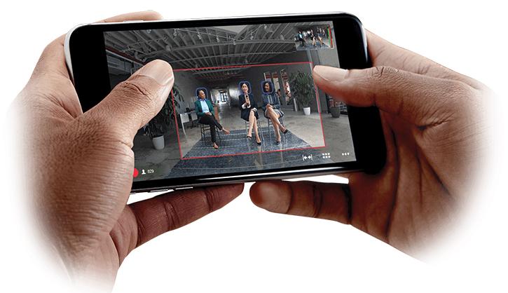 The Find Faces feature automatically identifies people in shot and a Live Follow button tracks a selected person automatically. The Live Follow feature can cut automatically to the subject most in motion. An Auto-Pilot setting adjusts the speed at which the camera makes the cuts.